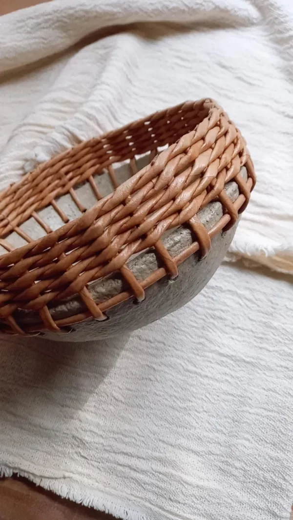 Cuenco Terra, sustentable, hecho 100% a mano con papel mache con detalle en cesteria de papel.