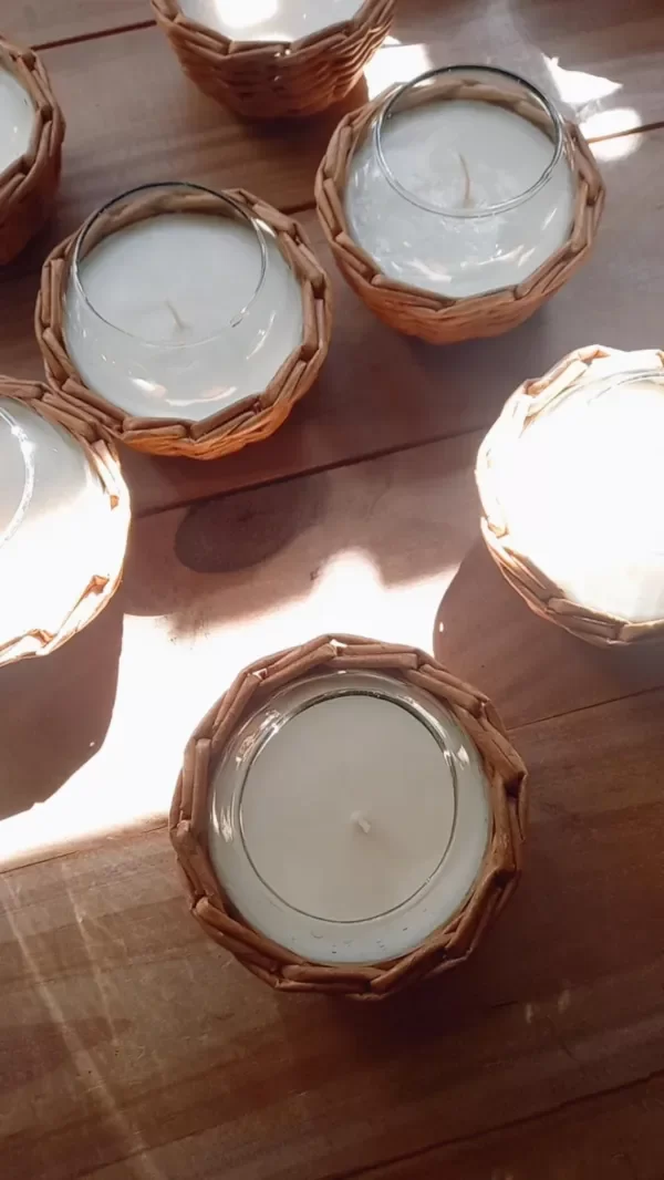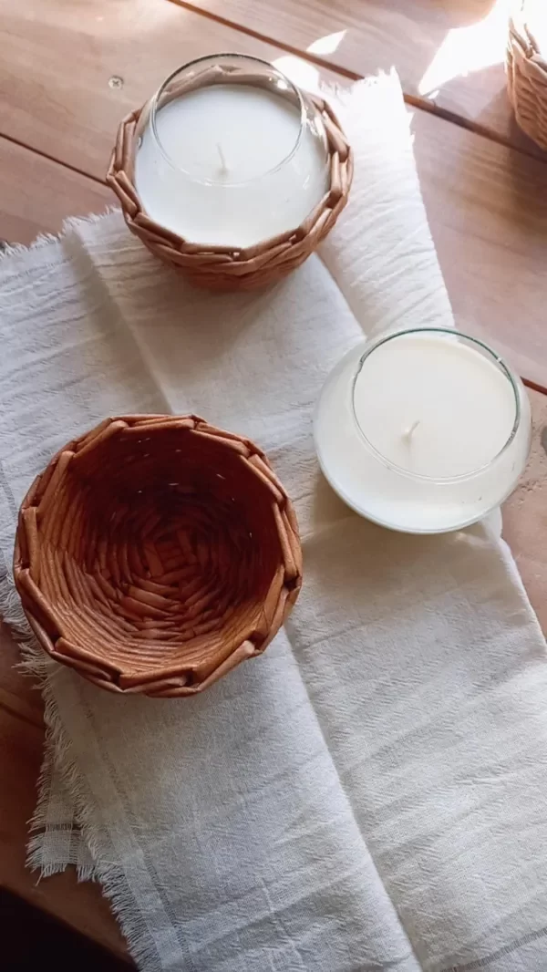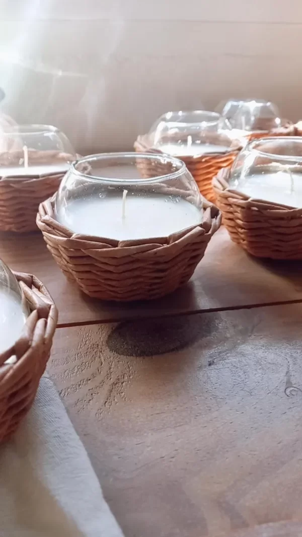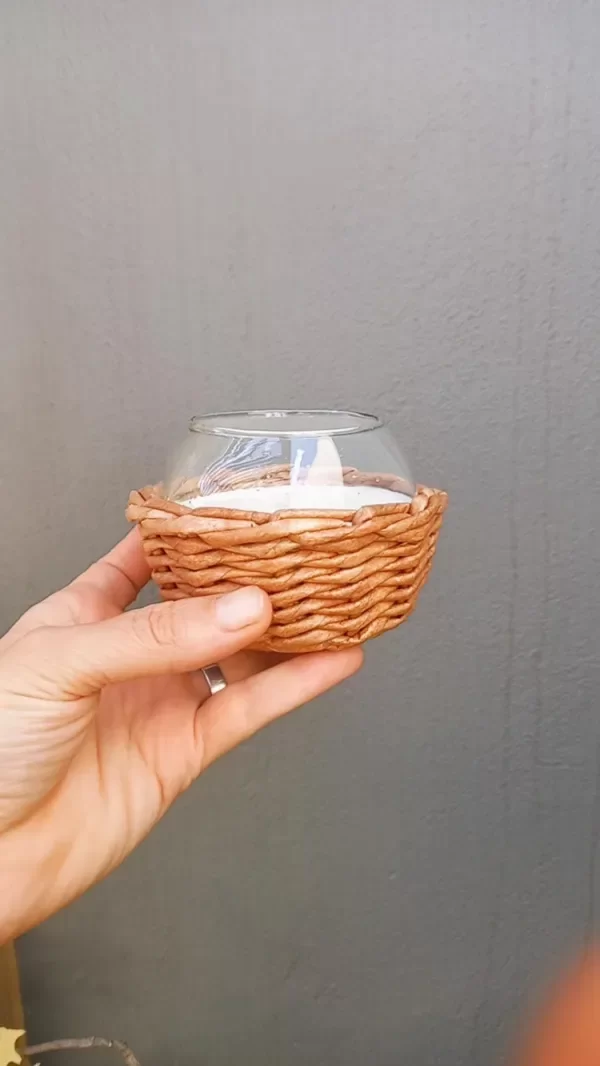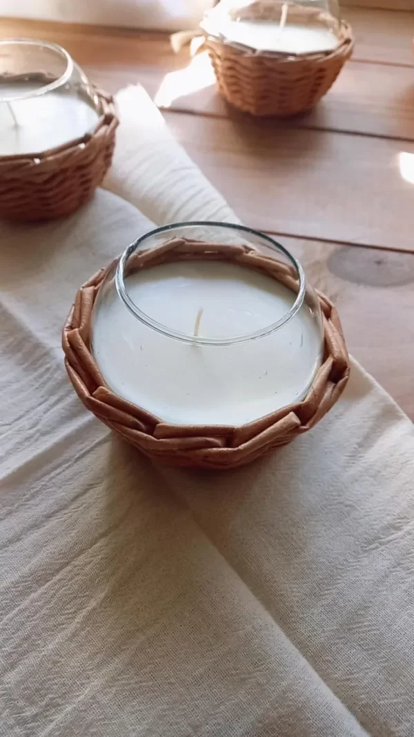 Cuenco de vidrio con vela de soja con aroma pomelo rosado, revestido con cestria de papel color natural.