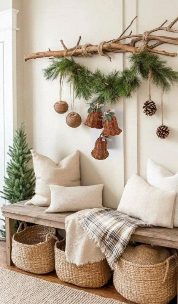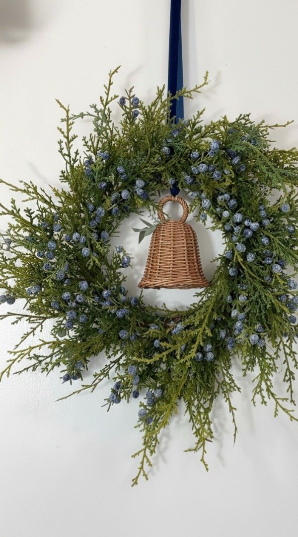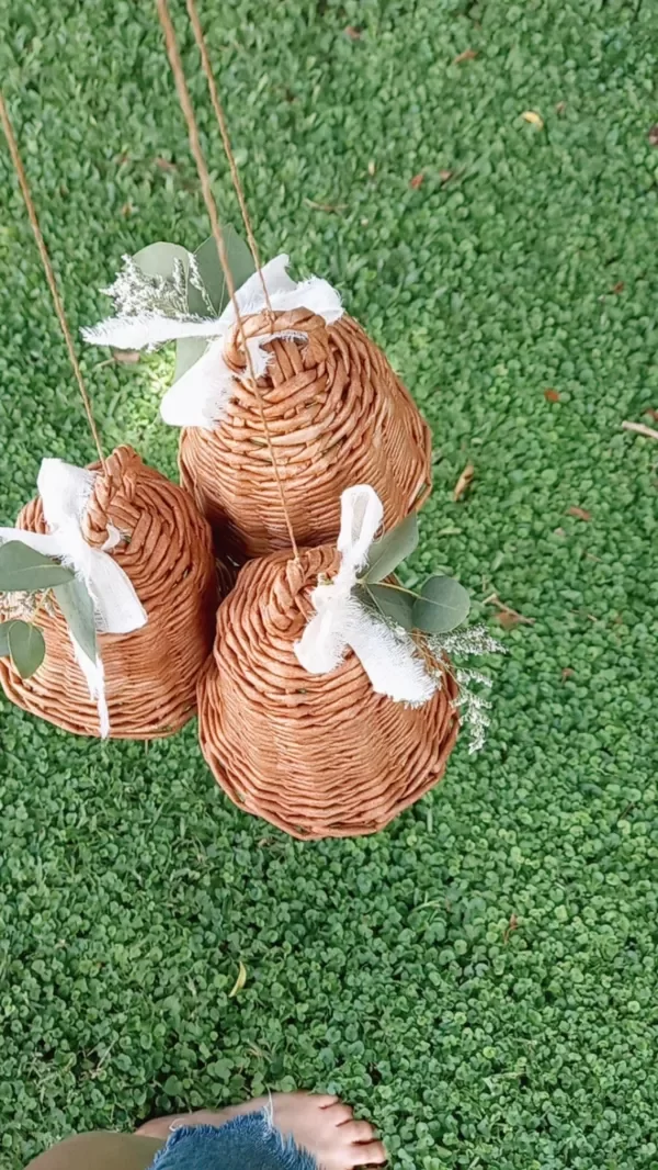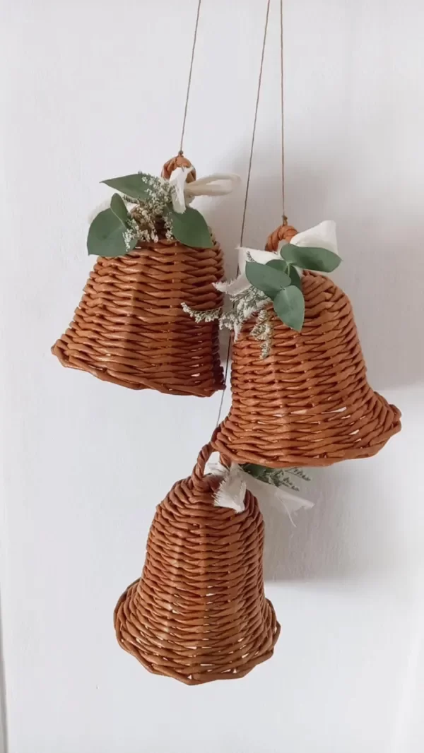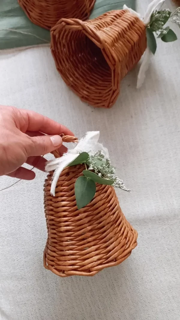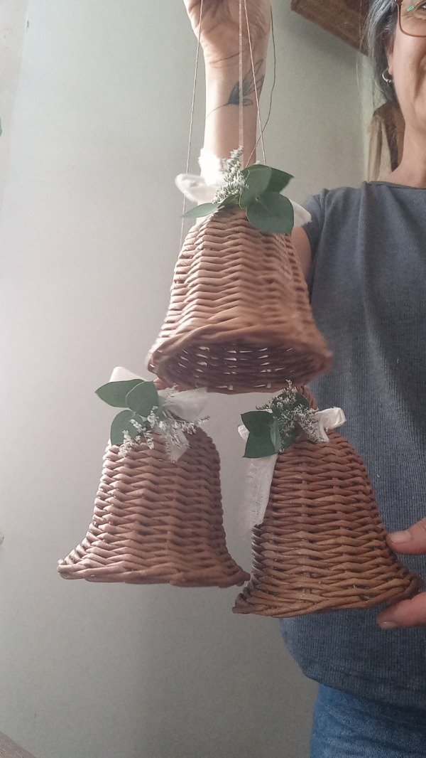 campana hecha a mano en cesteria con detalle floral, lista para colgar en tu espacio favorito y decorar todo el año!